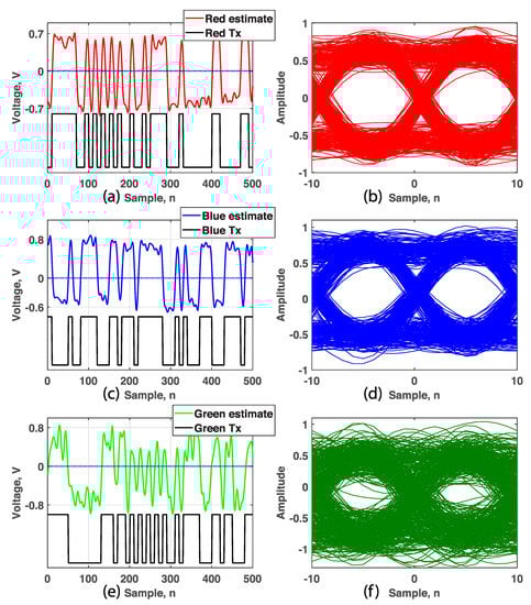 From (8) it can be seen that the 2nd column (λG) is significantly lower than the 1st and 3rd (i.e., λR and λB) for each of the Rx (i.e., rows). This is due to the considerably lower E/O conversion factor for the G LED chip (Figure 2b). Results for the estimated data (xRest, xGest, xBest) of the D-MIMO are shown in Figure 5, where (a), (c), and (e) display the transmitted and estimated data streams for λR, λB, and λG, respectively, whereas (b), (d), and (f) show their respective eye diagrams. As in the PS, the estimated waveforms shown in Figure 5a,c,e display the baseline wander [17], which is attributed to the AC coupling at the transmitter due to the use of bias tees and AC coupling between PDs and TIAs at the Rxs. Nevertheless, the estimates of the transmitted data show a good correlation with the original data sets.