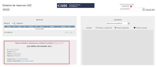 When the students are logged into the booking system, they can select the experiment to be carried out (Figure 4). Reservations are made and managed using the booking system. Finally, when the reservation date arrives, all of the information needed to access the experiment is shown to the student (Figure 5): user and password session, IP address of the computer, and the required communication port. The access is based on RDP (Remote Desktop Protocol), accessing a laboratory computer, where all of the required resources are available, being used by students to perform all practical experimentation. This access can be performed using a Windows, Linux, or Mac RDP client. Finally, instructions for connection between the student PC and experiment computer are provided for every operating system.