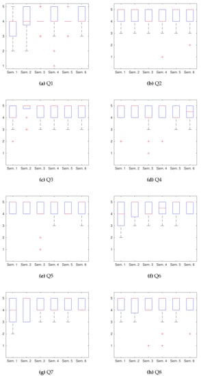 Eventually, taking into account the results for the general satisfaction by using the remote laboratory for real FPGA experiments in the subject, Figure 7g shows that students’ assessments are mostly rated between 4 and 5, with a median value of 4 or greater in different semesters.