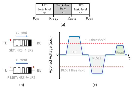(a) Memristance range and HRS/LRS correspondence with logic “0”/“1”. Intermediate forbidden state is defined by the highest LRS and the lowest HRS, respectively. (b) Memristor switching behavior when forward or reverse-biased. TE/BE stand for Top/Bottom Electrode. (c) Cartoon plot showing the required voltage pulses, which are higher than the switching thresholds, to be applied for SET/RESET memory write operations (light gray shade), and pulses of lower amplitude used for memory read operations (light green shade). Dashed horizontal lines denote the SET/RESET thresholds.