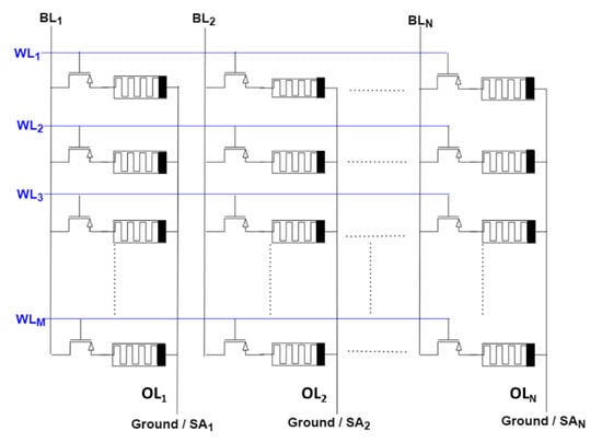 Figure 2 shows the design of a m × n transistor–memristor (1T1R) crossbar, which we assume in this work as memory sub-array. It consists of m wordlines and n bitlines with group-accessed transistors as cross-point selector devices to mitigate sneak path currents, which otherwise severely affect the performance of passive (selector-less) arrays [,]. Every wordline, WLi connects to the gate terminal of all the select transistors in the same crossbar row, so as to simultaneously select/enable all the n memristive cross-points in a memory word. Each bitline BLj drives all the m cross-points found in the same column of the array, whose memristors have their bottom electrode (BE) commonly connected to a crossbar output line (OL). Through the sensing circuitry, every OL is selectively connected either to logic components or to ground. Depending on whether a memory (read/write) or a logic operation is performed, the wordline decoder will activate simultaneously between one and three wordlines, while the target bitlines are driven accordingly with the corresponding read/write voltage pulses (or otherwise are left floating).