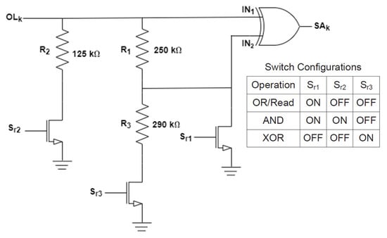 According to Figure 3, in the case of an OR gate, only the transistor Sr1 is conducting, pulling VIN2 to ground, whereas VIN1 results from the voltage divider between the two input memristors and resistor R1. The value of R1 was selected such that, when at least one of the memristors is in LRS, VIN1 will be high enough to be interpreted as logic “1” by the CMOS XOR gate and thus produce a logic “1” output. Note that, for a memory read operation, the SA function is practically equivalent to a logic OR gate but with only one input. Similarly, for an AND gate, there are two pull-down resistors connected in parallel, so that only when both input memristors are in LRS will the VIN1 voltage be high enough to cause a logic “1” output. An XOR logic operation is realized by the SA if only the transistor Sr3 is conductive. In such a case, the series combination of resistors R1 and R3 is activated, with VIN2 being now equal to the voltage on resistor R3. When both memristors are in HRS (LRS), both VIN1 and VIN2 are low (high) and equivalent to logic “0” (logic “1”). Thus, only when one of the memristors is in LRS does the CMOS XOR gate give a logic “1” output. For AND, OR, and XOR logic operations with more than 2 inputs, the required values for the pull-down resistors might have to be re-calculated. However, by using the exact same SA configuration as for the AND gate while activating a third input memristor (thus a third WL in the crossbar), we figured out that the same circuit can implement a three-input majority (MAJ) logic operation. Certainly, MAJ can be implemented in different ways, e.g., by comparing the current through the crossbar OL with a current threshold, as in Reference []. MAJ is worth being considered in such computational memory as it can accelerate certain tasks in arithmetic operations. Therefore, it is important that the considered SA circuit is able to implement MAJ computation as well. For readability reasons, Table A1 in Appendix A presents all possible SA configurations with their equivalent circuits, along with the mathematical expression describing the resulting voltage inputs applied to the CMOS XOR gate.