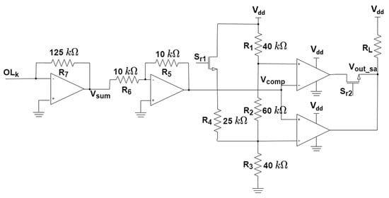 In this context, an enhanced scouting logic scheme was proposed in Reference [], but it used a more complex 1T1R array to achieve higher reliability of logic operations. In the same direction, inspired by the crossbar interface circuit proposed by Papandroulidakis et al. in Reference [], here we designed and evaluated the performance of an alternative and more flexibly parameterizable circuit implementation for the voltage-based SA, which can lead to a more robust behavior against HRS and LRS variability. More specifically, the proposed circuit shown in Figure 4 has a summing amplifier, followed by an inverting amplifier and a set of high-speed voltage comparators in the final stage with configurable thresholds. We clarify that this represents an alternative system-level SA concept, but yet not a compact and competitive circuit design solution, given the much larger circuit area it occupies.
