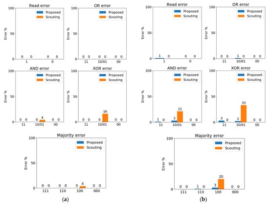 We subjected the two alternative SA implementations, as shown in Figure 3 and Figure 4, to a series of tests in order to evaluate the robustness of logic and memory read operations, while incorporating a certain percentage of variability to the expected HRS and LRS values of the input memristors. More specifically, instead of using fixed HRS/LRS = 125 GΩ/125 KΩ memristance values, the latter represented the mean values of Gaussian distributions. We tested all operations shown in Table 1 for all possible logic input combinations, each time taking 100.000 random samples from the HRS and LRS distributions. Using the equations presented in Table A1 and Table A2, while applying Vread = 0.85 V and Vdd = 2 V, and assuming 0.4 V as threshold voltage for the CMOS XOR gate [], we calculated the resulting voltages at the nodes of interest of both SA modules. Figure 5 shows the evaluation results, wherein an error corresponds to an erroneous logic output at the SA circuits for a given input combination. We repeated the tests for an increasing SD of HRS and LRS distributions. The results in Figure 5a,b concern 10% and 20%, respectively.