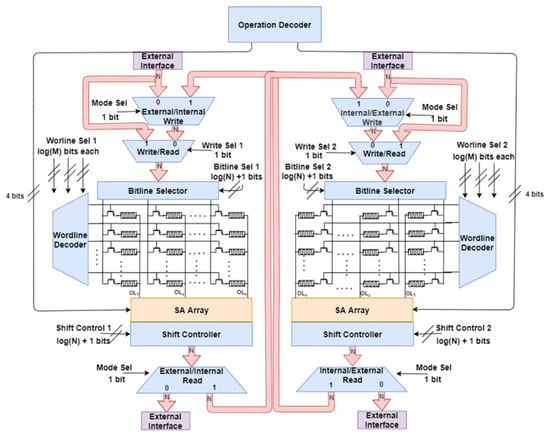 It is worth noting that the favorable performance characteristics of the twin-array are achieved owing to the enhanced peripheral circuitry. Figure 6, Figure 7 and Figure 8 present system-level designs rather than compact transistor-level circuit designs; thus, the area overhead compared to the driving circuit required only for memory operations is difficult to estimate. Enhanced peripheral circuitry could lead to associated heat dissipation problems. In this context, in order to minimize the area overhead in the SA Array, one solution would be to combine two crossbar OL per SA module, as suggested in Reference []. Thus, the number of SA modules in each sub-array would be half the number of OL. However, such solution will impact latency, as any read/write operation on a memory word would require two steps to be completed, since only half of the OL will be connected each time to ground.