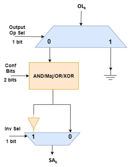 In this section, we shed light on each one of the modules composing the system shown in Figure 6. At the readout stage, there is an array of n identical sensing modules (SA Array). Figure 7 shows a block level description of one such module, which connects to a crossbar output line (OLk). Its functionality is configured via four control bits. Two of them are used as configuration bits of the SA circuit, as shown in Figure 4, for memory (Read) or logic operations. Another bit (Output Op Sel) is used in the top DEMUX to define whether the crossbar OLk will connect to the SA circuit, or to ground, which is necessary for memory write (SET/RESET) operations. One last bit is used as selection line in the output MUX shown at the bottom, to make readily available the inversion of the memory/logic result. The basic logic functions supported by the system (AND, OR, NOT, XOR, and MAJ) and their complements form a basis for more complex arithmetic operations.