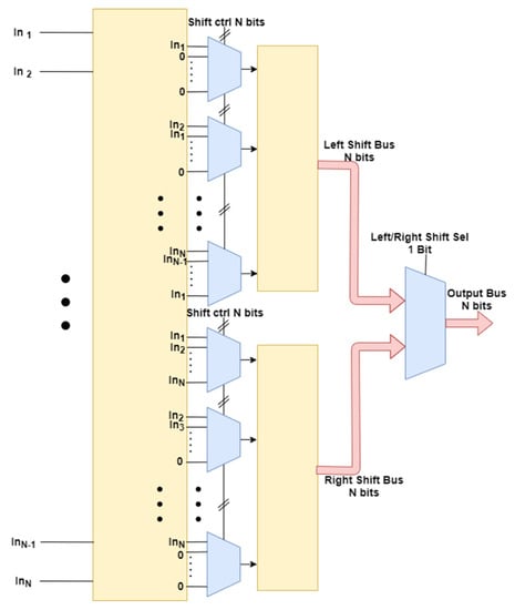 Compact block-level description of the Shift Controller module, which applies a number of logical left/right displacements to the N input lines In1…InN equal to the number given by the Shift Ctrl bits. The yellow blocks hide routing of interconnection lines between the modules (not shown for clarity).