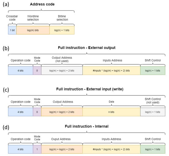 Description of the fields composing the system instructions. (a) The form of the address code present in all instruction types. The full instruction form for memory read/logic operations towards the external interface is shown in (b), and for memory write operations of externally applied input, it is shown in (c). The full instruction form for memory read/logic operations when the output is written to the adjacent sub-array is shown in (d). Unused fields are shown in a light gray color.