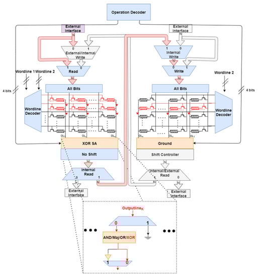 For readability reasons, Figure 10 shows graphically the required system configuration in order to perform an XOR operation on all bitlines of two active words of the left sub-array and store the result to an active word in the right sub-array, in the same cycle. The embedded text description in all blocks that represent the different modules of the system in Figure 10 describes their actual operation. For clarity, all the inactive modules are shown in a light gray color. Specifically, a read voltage is applied through the external interface to all bitlines of the left sub-array. The two words holding the input data are activated by the Wordline Decoder. In the SA Array, the four configuration bits activate the XOR operation in the internal module of every SA Array element (see the inset), without inversion of the logic output. Moreover, no shift is applied to the read data, which are connected through the output DEMUX to the internal data bus, and are thus connected to the selection lines of the MUXes in the write drivers of the right sub-array. There, an internal write operation is performed on all bitlines. The output/destination address is applied to the Wordline Decoder. The internal modules in the entire SA Array connect all OL lines to the ground, as required for the write operations to take place, so that the logic output can be simultaneously written to the target word.