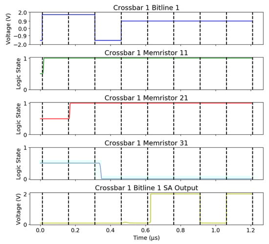 Such behavior is validated in the following sections through LTspice circuit simulation results. For the select cross-point transistors in each sub-array, we used 1 μm CMOS technology models. In most of the peripheral blocks, we preferred a behavioral description of circuit components to minimize simulation overhead and emphasize the functional characteristics of the proposed computational ReRAM, rather than the impact of MOS parasitics, which we mostly assumed negligible in the peripheral circuitry. Notwithstanding the above, in the internal SA circuit shown in Figure 4, found in the SA Array, we used macro-models of LM319 high-speed voltage comparators, with Vdd = 2 V. For all memristors, we used the hyperbolic sine-type model of a bipolar threshold-based switching memristor proposed by Yakopcic et al. []. Such a model has been correlated against several published device characterization data with very good precision, closely approximating performance of physics-based models []. Parameters were set in accordance with experimental data for amorphous silicon (a-Si)-type memristors [] that are suitable for digital applications, as follows: a1 = 1.6 × 10−4, a2 = 1.6 × 10−4, b = 0.05, Vp = 1.088, Vn = 1.088, Ap = 81,600,000, An = 81,600,000, xp = 0.985, xn = 0.985, alphap = 0.1, alphan = 0.1, and xo = 0.01. The read/write pulses applied to the bitlines were 150 ns wide, and the amplitude was 1.7 V for SET, −1.5 V for RESET, and 0.9 V for READ operations. The corresponding memristance boundary values (for a given Vread voltage) were RON = 125 KΩ and ROFF = 125 GΩ, whereas the SET/RESET switching time was 10 ns.