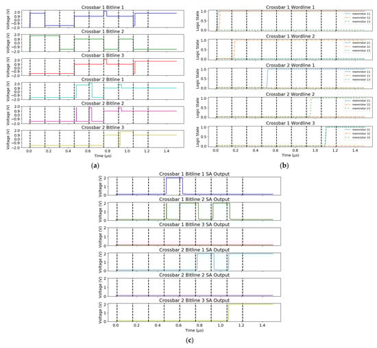 By observing Figure 12b,c, it can be figured out that, in the fifth cycle, the result of the MAJ operation at bitline 1 of crossbar 1, which is logic “0”, is written to the memristor in word 2 and bitline 2 of crossbar 2. Given that Cin is zero for the LSB stage, crossbar 2 has already a logic “0” in bitline 1, owing to the RESET write operation performed in cycle N° 3. Next, the recently produced Ci is copied to the memristor in word 3 and bitline 2 of crossbar 1, so that, in cycle N° 7, we can compute again the MAJ operation. However, this time, MAJ is performed at bitline 2 of crossbar 1 to produce the last Carry bit, which we simultaneously store in the memristor in word 2 and bitline 3 of crossbar 2. In Figure 12b, we can confirm that a logic “1” is stored in crossbar 2 as a final Carry bit to the memristor in word 2 and bitline 3, as expected. Finally, in the eighth cycle, we compute the result of Sum with another XOR operation performed in crossbar 2 with the contents of word 1, which holds the result of the previous XOR operation, and word 2, which holds the computed Carry bits. The result is stored simultaneously to word 3 of crossbar 1, which eventually holds “101” (equal to “011” + “010”), as we can confirm by checking Figure 12b.