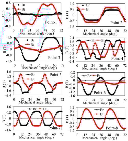 The corresponding variations in PM flux density waveforms of the eight key points are shown in Figure 2. Obviously, for Point 1 the tangential component Bt changes significantly whilst the radial one Br remains unchanged, which is totally reversed for Point 3, where Bt remains unchanged and Br varies considerably. For Points 2 and 4, both Br and Bt vary versus rotor positions but with the same and double the frequencies, respectively. However, for Points 5–8 in the stator, a significant DC-biased component can be found in the component of Br of Points 5 and 6. In Point 7, a phase-shift of nearly 90° exists between Br and Bt. However, for Point 8, Br is almost zero within a period of two rotor pitches (72°).