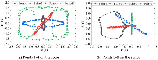 Figure 3 shows the trajectories of the radial and tangential flux density changes at eight key points when the machine is in no-load operation. There is not only an alternating magnetic field but also a rotating magnetic field in the stator and rotor cores. It can be seen that the change regularity of the flux density at each point on the stator side is completely different from the change regularity of each point on the rotor side. The flux density in the stator yoke and stator teeth changes in a single direction. The flux density in the stator yoke center is mainly a tangential component, while the stator tooth center is mainly a radial component. The stator tooth tip near the air gap has an obvious DC-biased magnetization component. The radial flux density and tangential flux density components at the junction of the stator teeth and the yoke are relatively large. The flux density of the rotor tooth tip has an obvious local hysteresis loop. The radial flux density and tangential flux density components at other points of the rotor are relatively large.