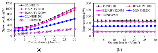 Effect of soft iron materials on core loss. (a) Stator core loss and (b) rotor core loss.