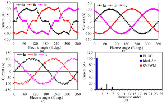 The current and harmonic content of different driving methods. (a) BLDC, (b) Ideal-Sin, (c) SVPWM, (d) Current THD.