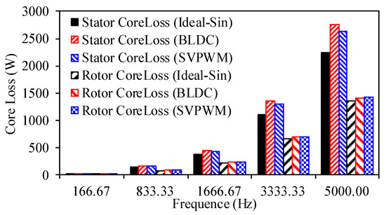 The effects of different frequencies on the stator and rotor core losses are shown in Figure 7. It can be seen that the core loss shows an obvious tendency to increase with the higher frequency. When the ideal sinusoidal current source is used to drive the machine, the calculated core loss is lower than those driven by the BLDC or BLAC methods. Obviously, the effect of different driving methods on the stator core loss is more pronounced than on the rotor core loss, and the stator core loss is dominant.