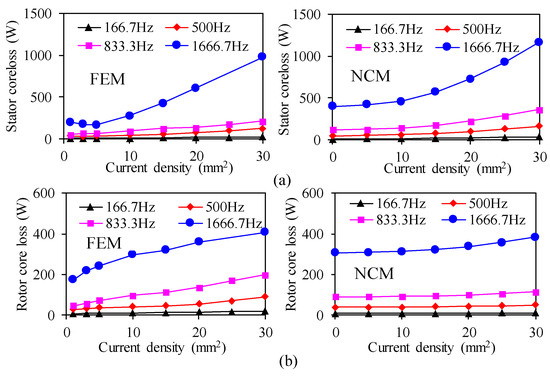 Since the prototype machine is still being processed, the core loss calculated using commercial FEA software was compared with and used to verify the numerical calculation of the core loss values used in this paper, as shown in Figure 8. Figure 8a,b show the core loss of the stator and rotor calculated by different calculating methods. The loss data in the left figure were calculated by commercial finite element software (ANSYS EM). The loss data in the right figure were calculated by the NCM. It can be seen that the results of the two methods of calculating losses are in the same trend, and the loss at low frequencies is very close to that obtained using the commercial FEM. However, at high frequencies, due to the consideration of DC bias and hysteresis loops, the calculated core loss is larger, which is ignored in the FEM.