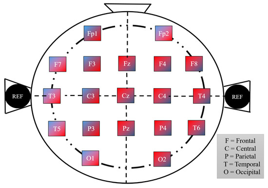 The standard international 10–20 system for electrode placement and Ag/Ag-cl electrodes were used for the recording of EEG signals [30]. The electrodes were placed in the frontal region (F7, F8, Fz, F3, and F4), parietal region (P3, P4, and Pz), occipital region (O1 and O2), central region (C3, C4, and Cz), temporal region (T5, T6, T3, and T4), and anterior frontal (Fp1 and Fp2), respectively, during EEG recording [13,30]. Independent component analysis (ICA) was used for the filtering of ocular, cardiac overlapping, and muscle artifacts from the recorded multi-channel EEG signals.