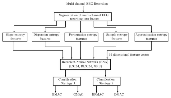 Other RNN variants, such as bidirectional LSTM (BLSTM) and gated recurrent unit (GRU) [29], have not been used for the categorization of mental arithmetic tasks, such as BFMAC vs. DMAC and BMAC vs. GMAC, respectively, using EEG signal features. The novelty of this work is to explore various state-space domain non-linear entropy features and RNNs for mental-arithmetic-based cognitive workload task classification using EEG signals. The major contributions of this work are highlighted as follows: