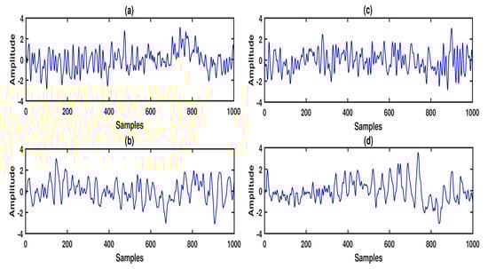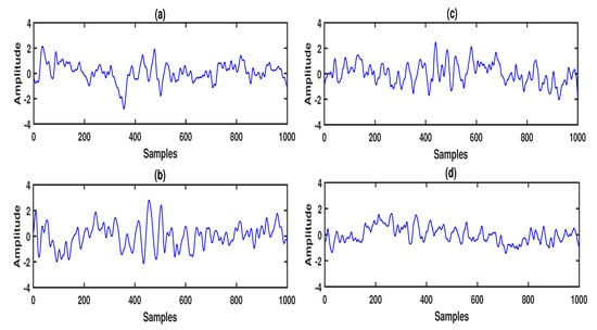In this study, we considered a non-overlapping window of 2 s duration ( samples) for segmenting each multi-channel EEG recording. A total of 30 frames were evaluated from each multi-channel EEG recordings. The total number of multi-channel EEG frames considered in this work was . Figure 3 and Figure 4 show the EEG frames of the Fp1 and O1 channels for BMAC (Figure 3a,b)) and GMAC (Figure 3c,d) tasks as well as DMAC (Figure 4a,b) and BFMAC (Figure 4c,d) tasks. We observed significant differences in the amplitude values and temporal characteristics of EEG signals between BMAC- and GMAC-, and between BFMAC- and DMAC-based cognitive tasks.