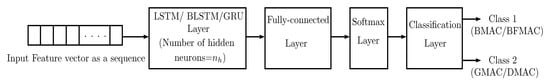 In this study, the classification model shown in Figure 4 comprises the input layer, RNN variant layer, fully-connected (FC) layer, softmax layer, and classification layer. The input feature vector at the tth time-step is denoted as . The LSTM/BLSTM/GRU layer was used to process the input feature sequence. The number of hidden neurons considered in this layer is denoted as . The output obtained in the LSTM/BLSTM layer is denoted as where T is the total number of time-steps considered for the LSTM, BLSTM, and GRU layers. For the GRU layer, the output is the same as the memory, .