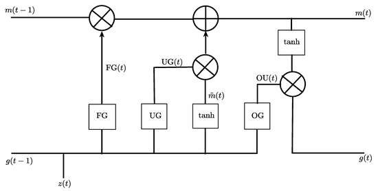 where and are the weight and bias values for forget gate. Similarly, and the are termed as the weight and the bias values for update gate. Moreover, and are the weight and bias values at the output gate. ‘f’ is denoted as the sigmoid activation function. The operator ⊗ is termed as the Hadamard product [41].