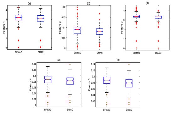 Box-plots showing the within-class variations for the Fp1-channel EEG signal dispersion entropy, F7-channel EEG signal slope entropy, C4-channel EEG signal approximation entropy, O1-channel EEG signal sample entropy, and O1-channel EEG signal permutation entropy features for the BFMAC vs. DMAC classification task are shown in Figure 8a–e, respectively. From these plots, the median values of each entropy feature were different for the BFMAC and DMAC classes. Similarly, we show the mean and standard deviation values of different entropy features for the Fp1, F7, C4, and O1-channel EEG signals in Table 3.