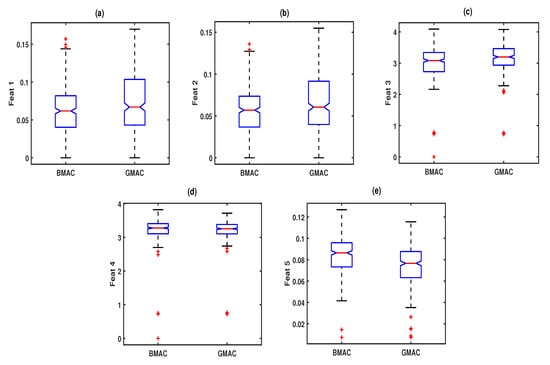 Similarly, the box-plots of the Fp1-channel approximation entropy, Fp1-channel sample entropy, F7-channel dispersion entropy, C4-channel slope entropy, and O1-channel permutation entropy features for the BMAC and GMAC classes are depicted in Figure 9a–e, respectively. The statistical analysis of all entropy features of the Fp1, F7, C4, and O1-channel EEG signals for the BMAC and GMAC classes are shown in Table 4. From the table, the Fp1-channel approximation entropy, dispersion entropy, sample entropy, and permutation entropy features had higher mean value differences between the BMAC and GMAC classes when compared to the slope entropy features.