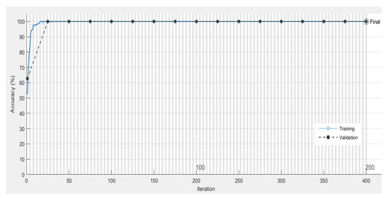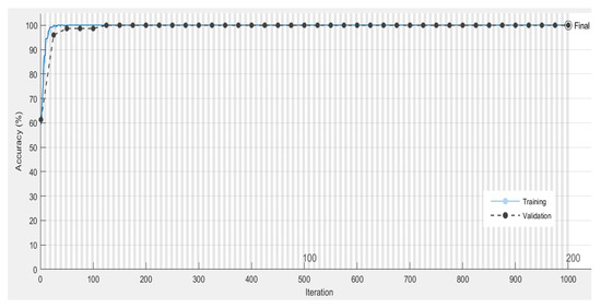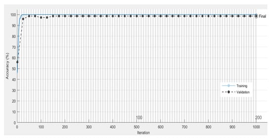 The plots of accuracy versus the number of iterations obtained using the LSTM, BLSTM, and GRU classifiers for the automated classification of the BFMAC vs. DMAC tasks are shown in Figure 10, Figure 11 and Figure 12, respectively. Both the training and validation accuracy values were 100% for the LSTM classifier. Similarly, for the BLSTM classifier, the training and validation accuracy values obtained were 100% and 98.54% after 200 epochs. The training and validation accuracy values were more than 100% using the GRU classifier for the automated classification of the BFMAC vs. DMAC tasks.