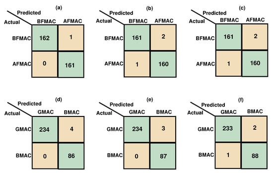 (a) Confusion matrix of the LSTM classifier for the BFMAC vs. DMAC classification task using one trial hold-out CV, (b) Confusion matrix of the BLSTM classifier for the BFMAC vs. DMAC classification task using one trial hold-out CV, (c) Confusion matrix of the GRU classifier for the BFMAC vs. DMAC classification task using one trial hold-out CV, (d) Confusion matrix of the LSTM classifier for the GMAC vs. BMAC classification task using one trial hold-out CV, (e) Confusion matrix of the BLSTM classifier for the GMAC vs. BMAC classification task using one trial hold-out CV, (f) Confusion matrix of the GRU classifier for the GMAC vs. BMAC classification task using one trial hold-out CV.