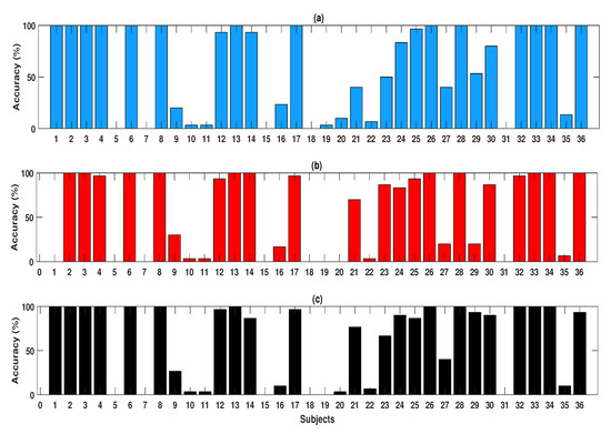 The subject-wise accuracy values using the LSTM, BLSTM, and GRU classifiers from multichannel EEG instances are shown in Figure 14a–c. From these figures, the average accuracy values obtained using subject-independent CV for the LSTM, BLSTM, and GRU classifiers were 58.70%, 55.74%, and 60.55%, respectively. The GRU classifier obtained the highest classification accuracy with subject-independent CV over other types of RNN classifiers for the classification of the BMAC vs. GMAC tasks.