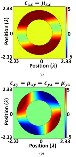 Equation (6) results in anisotropic and inhomogeneous permittivity and permeability tensors for the spherical shell. Note that the results lead to a perfect impedance matching with no reflection at the boundaries of the material region and free-space, which is shown in Figure 3. Such an anisotropic and inhomogeneous transformation medium can be realized by discrete metamaterials and structures such as periodic split ring resonators (SRRs) [30]. The theoretical material parameters in Equation (6) were validated using full-wave simulations in the finite element solver COMSOL Multiphysics ®, as shown in Figure 3. An incident TE plane wave of 10 GHz frequency was used from left to right along the x-direction. The inner radius , and the outer radius. The radii and of the metamaterial coating were chosen by closely following the similar works reported in [24] and [31]. As the dipole element was full-wave (), it was necessary to choose an inner radius of the metamaterial coating that was bigger than the length of the dipole, so that it follows the transformation rule from Equation (4). The metamaterial coating is located in the radiative near field region, as, where D = L = maximum linear dimension of the antenna, and = wavelength of the EM wave.