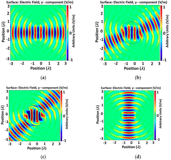 The electric fields for the proposed TO-based single element beam-steerer for different values of loss factor (): (a); (b); (c); (d).
