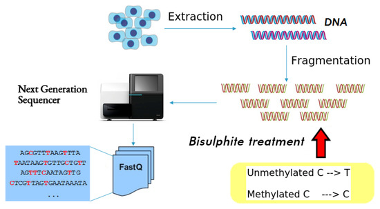 DNA methylation analysis requires a specific treatment of DNA that modifies its sequence, as well as software tools for their analysis. The methylation data can be obtained through bisulfite sequencing, which provides comprehensive DNA methylation maps at single-base pair resolution [5]. Figure 1 illustrates this process. The first step is the DNA extraction. Next, the Polymerase Chain Reaction (PCR) breaks up the DNA sequences into many fragments and makes multiple copies of these fragments, which are called reads and are the actual samples to be analyzed. At this point, bisulfite is added to the resulting DNA reads. Bisulfite treatment converts unmethylated cytosines (Cs) into thymines (Ts), which gives rise to C-to-T changes in DNA sequence after sequencing, while leaving methylated cytosines (5mCs) unchanged. Finally, the bisulfite-treated reads are processed by a sequencer, which reads each read and yields a text containing the sequence of nucleotides in the read, together with other meta-information such as the quality of the read, etc. (this is known as fastq format). Since the sequencer carries out this process with all the reads, the output of the sequencer is a text file in fastq format (usually huge) containing the sequence detected for each sample (read).