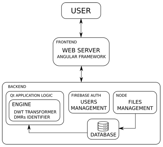 The basic architecture of the system can be seen in Figure 2. The user interacts with the system through the front end downloaded to the client browser. The front end is responsible for establishing communication with the backend servers, depending on the services requested by the user. The backend includes: the authentication service that will validate the user, the file manager that provides access to the data loaded by the user, and the main service of wavelet transformation and identification of DMRs. At the server side, the database module is responsible for the file management, and it provides the application logic module with the required data, according to the user requests.