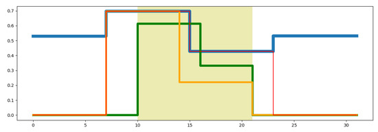 Thus, the starting and ending point of the region where the wavelet transformation is applied will always be the closest exponential position to the lower and upper positions requested by the user. Figure 3 illustrates an example of how this strategy makes a consistent visualization of the segments requested by users with those segments obtained from the DMR identification. Figure 3 shows an example of the limits for the wavelet transformation (WT) requested by the user (shaded region) at level three and the actual limits computed by the system. The blue line represents the methylation signal used to identify DMRs. The green line represents the WT of the requested region by the user. The orange line represents the WT region performed by the system after the adjustment of the lower limit. The red lines correspond to the portion of the methylation signal over which the wavelet transformation has been applied. This Figure shows that there is a guard band between the red lines and the limits requested by the user (shaded region).