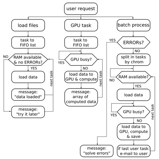 The proposed web-based application must be capable of managing the concurrency of several tasks requested by different users. Thus, the backend system must manage the RAM memory availability for loading the data from the files and the GPU state (busy or stopped) for the GPU computation tasks. Figure 4 shows the flow diagram for concurrent requests. The management of each request depends on the request type (load files, GPU computation or batch process). Each type of request has a different FIFO list of tasks. From these task lists, independent processes are launched. The procedure for loading files (in the visualization tab) do not need GPU availability but RAM memory, and therefore it is necessary to check the RAM memory before starting this process. The GPU tasks implicitly required in the visualization tab in turn require the use of the GPU, so the GPU state must be checked before loading the data array and computing the DWT of the methylation signal. Another independent process that can be requested by the user is the batching process (in the user interface tab labeled as “batch process”). This is a long and non-interactive procedure, so in this case the system sends an email to the user when the process ends, and the procedure is split into smaller tasks. All these strategies are focused on achieving a better performance in the GPU and RAM memory use when there are concurrent accesses to the server.