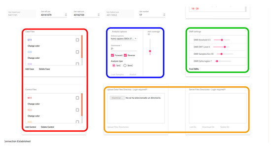 The user interface of the proposed web-based tool has been defined for two user roles: the guest role, which allows interaction with a demo database available in the system, and the registered user role, which allows a full interaction of the user with the system through the interface, using the WebSocket protocol. A registered user can upload any sample file to the server via secure https. Figure 5 shows a snapshot of the user interface, including the tab for selecting the files to be stored in a secure database. This figure shows, marked with a red line, the area including the tabs for selecting the files corresponding to the case and control samples to be visualized and analyzed. The initial parameters applied to the loaded samples are marked with a blue line. The interface area marked with a green line shows the controls for setting the parameters used for DMR detection. Finally, the area marked with an orange line highlights the area for the uploading service (only for registered users).