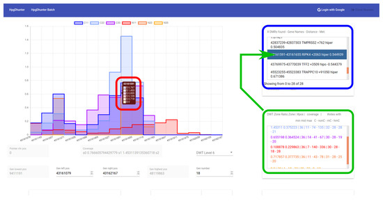 Figure 6 shows a snapshot of the user interface, including the list of segments returned by the server with the average methylation difference between the two groups (case and control), according to the parameters set by the user. The interface area marked in blue shows the list of all DMRs found by the server. The interface area marked in green shows information about the ratio, coverage and position of the selected DMR. Finally, the interface area marked in red shows the coverage ratio of each sample at that position and the wavelet transformation level. From the list of the DMRs detected, the user can select each one of them to visualize the methylation signals of the samples at that area. The user can interactively change the transformation level, zoom and scroll in the horizontal direction, focusing his/her attention on any area. Finally, the user can access to more specific information of any desired position by clicking on the left mouse button at that point of the graph. The user browser will open a new tab with the Ensemble Organization web page: grch37.ensembl.org, showing a 1000 bases width area centered at the clicked position.