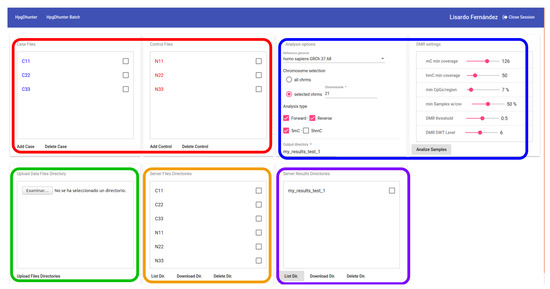 In addition, a registered user can request the identification of the DMRs of the whole genome by the batch option. Figure 7 shows a snapshot of the user interface for this option. In this figure, we have marked in green the area showing the local sample files to be uploaded. We have marked with an orange line the user directories uploaded to the system. The red line shows the interface area showing the control and case samples to be compared to identify DMRs. We have enclosed in a blue line the area showing the parameters for DMR identification. Finally, we have marked with a purple line the area showing the server directory where the results are saved (this tab window is not for visualization purposes, but for the identification of DMRs of all the chromosomes that the user needs, yielding the results in files ready to be downloaded). Since the batch DMR detection process may take a large time to be completed, the system shows a message informing the user that an email will be sent when the process is finished and the files containing the results are ready to be downloaded.