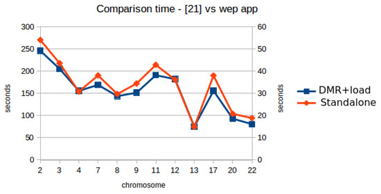 Figure 9 shows a comparison between the performance evaluation in [19] and the same test done with the web application (user waiting time for DMRs detection plus time required for loading files, the values in the column labeled as “T1 DMR + load” in Table 2). The scale on the right side of Figure 9 (Y-axis) correspond to the values shown in Table 2. The scale on the left side of Figure 9 correspond to the values for the same metric shown by the standalone tool [19]. It can be seen a very similar shape in the two curves, due to the type of files for each chromosome. However, a significant speedup is achieved by the web-based application (around 5×, since the values in the scale of the left side are five times higher than the ones on the right side). Therefore, we can state that the web-based application improves the user experience regarding the standalone version. Table 2 also shows the communication delay in milliseconds and the number of DMRs identified. The behavior of these variables is the same of the first dataset, where the communication delay has a direct relation with the number of DMRs identified.