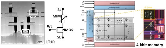 Cross-sectional transmission electron microscopy (TEM) image and schematic of the 1T1R memory cell (left) and block diagram and micrograph of the 4-kbit memory device (right).