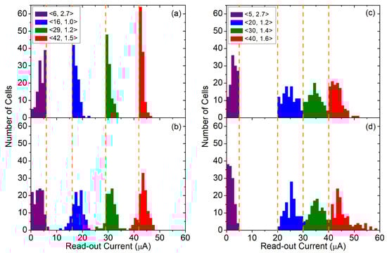 Histograms of the experimental read-out current distributions measured just after the switching transition (a–c) and at the end of the M-ISPVA; (b–d) for the four optimized conductive levels (a,b): HRS (<6, 2.7>), LRS1 (<16, 1.0>), LRS2 (<29, 1.2>), and LRS3 (<42, 1.5>); and for the four non-optimized conductive levels (c,d): HRS (<5, 2.7>), LRS1 (<20, 1.2>), LRS2 (<30, 1.4>), and LRS3 (<40, 1.6>) [].