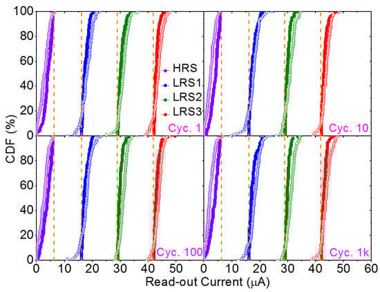 Once the optimized combination of programming parameters was experimentally proved to successfully define non-overlapped conductive levels despite the inherent DTD variability present on HfO-based RRAM arrays [,], the stability of the four conductive levels during the subsequent switching cycles was tested. An endurance test consisting of 1 k reset-set cycles between the HRS and the corresponding LRS was carried out on each batch of 128 RRAM devices in order to assess the CTC variability. As shown in Figure 3, the experimentally measured read-out current CDFs associated with each of the four conductive levels remain essentially unchanged along the whole endurance test. The existing CTC variability has no significant impact on the definition of the four conductive levels as the switching cycles go by.