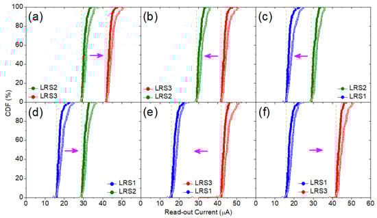 In order to further assess the CTC variability, the switching between conductive levels was experimentally tested in a way hardly shown in the literature, namely, the inter-levels switching. All possible LRS-LRS transitions (by using the HRS as an intermediate step) were carried out on the same batch of 128 RRAM devices. In Figure 4, the CDFs of the experimentally measured read-out currents for the three LRS conductive levels are shown before and after, respectively, performing each one of the six possible LRS-LRS transitions. All transitions were successfully accomplished independently of the particular history of conductive levels previously programmed on the RRAM batch.