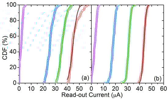 Finally, the experimental CDFs corresponding to the read-out current distributions depicted in Figure 2b,d, that is, the values measured at the end of the M-ISPVA for the optimized and non-optimized combination of programming parameters, respectively, were fitted by using the behavioral model presented previously. As Figure 5 illustrates, the Gaussian curves fit with very high accuracy the experimental data for all four conductive levels in both programming approaches. The average () and standard deviation () values for the fitting Gaussian CDFs are summarized in Table 2.