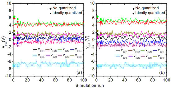 The accuracy of the VMM operation was assessed by multiplying an 8 × 8 matrix with a 1×8 vector, both randomly generated in the range from −10 to 10. The vector was mapped into input voltages in the range between 0.0 and 0.5 V, whereas the synaptic weights of the matrix were quantized in seven levels by using Equation (2) and then mapped into the differential RRAM pairs as the corresponding conductive levels. Several Monte Carlo simulations were launched in order to consider the variability featured by the RRAM devices. Figure 7a,b summarize the results of the simulation study (solid lines) by using the non-optimized and the optimized set of M-ISVPA parameters, respectively. In each simulation step, the conductances of the RRAM devices were randomly modified according to the statistical distributions for each level depicted in Figure 5. For a better evaluation of the results, the VMM outputs were also calculated without taking into account the variability, setting the conductance of the RRAM devices at the mean value of the Gaussian distribution for each conductive level. Here, two scenarios were taken into account, namely, no quantized weights in the matrix (square symbols and dashed lines in Figure 7), which produces in fact the exact output values, and ideally quantized weights in the matrix (circle symbols in Figure 7), which omit the errors linked to the fact that experimental RRAM conductive levels are not evenly spaced.