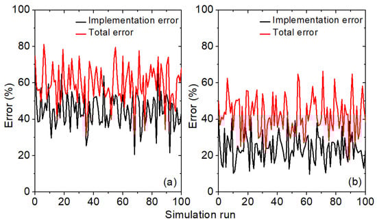 Total error (red lines) and Implementation error (black lines) for the 100 Monte Carlo simulations in Figure 7 when using the non-optimized (a) and the optimized (b) set of M-ISVPA programming parameters.