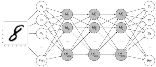 Finally, the 8 × 8 VMM architecture was extended and integrated in a 4-layer feedforward DNN with the aim of evaluating the impact of the RRAM variability on the accuracy in the classification task of the MNIST database []. This classifier is a multi-layer perceptron (MLP) that uses the backpropagation algorithm for optimizing the log-loss function by means of the stochastic gradient descent and ReLU activation functions []. The DNN was trained during 500 epochs or until the loss (a prediction error) did not increase by at least 10−4. The architecture employed for implementing the DNN is depicted in Figure 9 and consists of 784 neurons () in the input layer (one for each of the 28 × 28 pixels of the MNIST database images), 10 neurons () in the output layer (one for each different class), and three hidden layers of 256 neurons () each. Overall, 334,336 synapses are involved, whose weights were quantized by means of the Uniform-ASYMM scheme. The variability was introduced to the synaptic weights according to Equation (3) after the training and the quantization process.