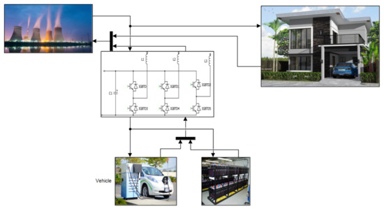 Models for V2H systems have been presented in numerous papers [7,8,9,10]. These papers are concerned with the optimal energy sizing [5] or algorithm [3,7,8] for controlling such a system, but without detailed simulation models for the power converters. On the other hand, there are papers (for example [11]), where models for individual converters are presented, but without full integration with other models. Controlling the process of energy conversion between the battery of the electric vehicle when used as an energy storage element in a V2H system is the topic of [12,13,14]. Using artificial intelligence for the control implementation, as shown in [15,16] is also an interesting proposition.